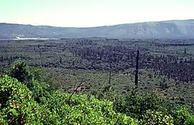 Brushy Butte is a small, poorly studied,[2] shield volcano located immediately east of Timbered Crater, south-southeast of the Medicine Lake Highlands in northern California, U.S. (near where Siskiyou County, California is adjacent to Shasta County, California). This volcano is considered to have formed soil development and a degree of revegetation similar to that of Hat Creek flow.[3] There is no current information on any Holocene eruptions from Brushy Butte, the last known eruption for the Brushy Butte was in the Pleistocene age, and the eruption was considered to be over 10-20 years, this was found based on the different lava flow landforms created and their placement around the interior of the volcano.. [4] Brushy Butte is located in a rifting area and the type of magma that erupted is called tholeiitic basalt; a type of lava that is dark and it contains 45 to 53 percent of silica, rich in iron and magnesium.[5]