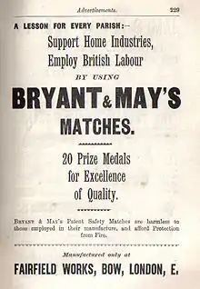 Bryant and May was involved in three of the most divisive industrial episodes of the nineteenth century, the sweating of domestic out-workers, the wage "fines" that led to the London matchgirls strike of 1888 and the scandal of "phossy jaw". The strike won important improvements in working conditions and pay for the mostly female workforce working with the dangerous white phosphorus.[18]