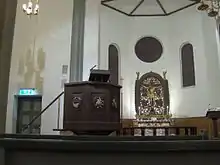 The church is made of brick and can accommodate 400 people.[1] There is a cemetery next to the church.[1][3] An urn with the remains of the film director Rasmus Breistein is kept at the church.[4]