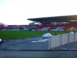 Initially, the stadium was planned to be located on the border between Time and Klepp. However, obtaining a construction permit for the site proved difficult due to its agricultural zoning, and the club eventually settled for a new location approximately 900 meters south of the current stadium.[7] Bryne intended to have the stadium completed in time for the 2008 season, but unfortunately, the project hit a snag in 2010 when developer Jæren Arena AS went bankrupt, and the plans were abandoned.[8] As a result, Bryne is currently planning to redevelop their current stadium.
