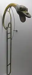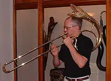 There are more than 60 buccins in museums throughout the United States and Europe.[2]. When the International Trombone Association was founded in 1972, it chose the buccin for its logo, after an instrument owned by New England Conservatory of Music in Boston. Lyon (France) seems to have been a center of buccin manufacturing with buccins made there currently on display in Paris (Dubois & Couturier) and Boston (Tabard). The photo above shows Douglas Yeo with a buccin made by another Lyon maker, François Sautermeister (c. 1830) that was restored in 2004 (and a new slide made after historical models) by James Becker of Osmun Music. Beautiful buccins by Guichard (Paris) are on display in Edinburgh and Brussels and the Metropolitan Museum of Art in New York has an extensive collection of buccins made in France, Italy and Belgium. John Webb, an English maker, has made modern reproduction buccins, one of which may be heard played by Ben Peck of Berlioz Historical Brass on Clifford Bevan's "Les Mots de Berlioz" on the CD Le Monde du Serpent.[3] Stephen Wick played buccin on the premier recording of Berlioz's Messe under John Eliot Gardiner.