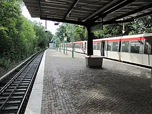 Buchenkamp is a station in Volksdorf on the Großhansdorf branch of Hamburg U-Bahn line U1. It is the last station on the Großhansdorf branch that is within the city of Hamburg, as the Schleswig-Holstein state line is shortly after the east end of the platform.