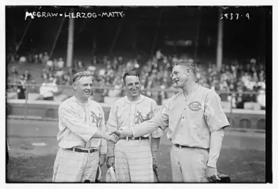Though Herzog and McGraw had parted ways uncomfortably last time, the Giants' manager made it clear upon Herzog's return that all he cared about was winning the pennant, and he was willing to overlook any dislike he might have for the infielder.[6] Herzog assumed the third base job, bringing a great deal of energy to the position as the Giants won the NL pennant by five games.[5][6] In 69 games (247 at bats) for New York, Herzog batted .267 with 37 runs scored, 66 hits, 14 doubles, four triples, one home run, 26 RBI, and 22 stolen bases.[5] His combined totals between Boston and New York were a .290 average, 90 runs scored, 157 hits, nine triples, six home runs, and 67 RBI.[5] Herzog's 33 doubles tied with Bill Sweeney for fourth in the NL, and his 48 stolen bases tied with Red Murray for fifth.[11] Facing the Philadelphia Athletics in the World Series, the Giants struggled to hit, and Herzog was no exception. He batted only .190 as the Giants were defeated in six games.[12]