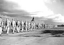 Graduating aerial gunners pass in review during their graduating ceremony at Buckingham Army Airfield. A base band was also playing at the ceremony. Reviews were also a way to impress visiting army brass, visiting politicians and other dignitaries.