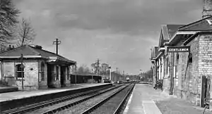 In 1915, the LNWR made a number of economies to the line, one of which included the closure of the small signal box in the goods yard, 750 yards to the north of the station. The double-track section between the station and signal box - the only doubled section on the line - was severed at the station and a buffer stop installed on the down line. The up and down lines were then reconnected by slewing a section of track across.[11]