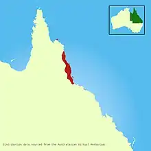 The natural range of Buckinghamia celsissima is northeastern Queensland from near Rossville to the Paluma Range, north of Townsville, at altitudes from 200 m (660 ft) to 1,000 m (3,280 ft).[5][7][8]