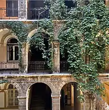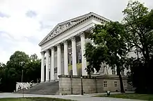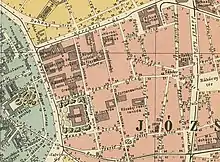 The Palace District contains important educational and cultural institutions. Between the Múzeum körút and Puskin utca is the Humanities Faculty of Budapest's Eötvös Loránd University,[16] built 1880-3 by Imre Steindl, also the architect of the Parliament building.[17] The central administration and many of the departments of the city's Semmelweis University (of medicine) occupy the block between Üllöi út, Baross utca, Mária utca and Szentkirályi utca.[18] They had appeared on maps by 1896 and are of a similar style to the nearby Eötvös Loránd University buildings. In addition, the Semmelweis University's Faculty of Health Sciences and the Hungarian Society of Therapists are housed in the former sanatorium and medicinal baths at Vas utca 17 (see photo). The Pázmány Péter Catholic University[19] occupies two buildings on Szentkirályi utca, while the German-language Andrássy University is housed in the Festetics Palace.[20] The Arts and Humanities Faculty of the Károli Gáspár University of the Reformed Church of Hungary[21] is at Reviczky utca 4 and plans to expand ts presence in the Palotanegyed, into the former Károlyi palaces between Reviczky utca and Múzeum utca once their current redevelopment has been completed.