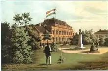 The communist regime neglected the district's buildings and committed some great acts of vandalism, especially the demolition in 1965 of the city's National Theatre, until 1908 the Népszínház (People's Theatre – or Volkstheater) on Blaha Lujza tér.[39] This building, much loved by Budapesters, had been constructed in 1875[40] to the designs of Fellner & Helmer. The loss of the National Theatre still seems to leave a gap on Blaha Lujza tér. A street on the eastern side of the József körút which led to the Népszínház is still called Népszínház utca. In 1948 the regime also demolished the National Stables behind the Museum. In 1952, it used part of the area to construct a concrete bunker designed to enable the regime to continue broadcasting in case of emergency including nuclear attack. The interior ministry also used it for conducting wiretaps. In 1969 this was incorporated into a larger Hungarian Radio office block equally unsympathetic to its grand surroundings.[41]