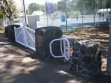 In July 1953 memorial gates were added to the entry of the memorial sports ground on Main Street. The gates formalised the entrance and consisted of four low bluestone pillars with decorative timber gates, turnstile, and a plaque with the inscription "We Will Remember Them". The official unveiling was held on 3 July 1953 with visiting dignitary, Hon. Josiah Francis, Minister for the Army, opening the gates. All materials for the memorial gates were donated by locals.[62][63][64][1]