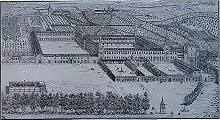 Buen Retiro Palace (Spanish: Palacio del Buen Retiro) in Madrid was a large palace complex designed by the architect Alonso Carbonell (c. 1590–1660) and built on the orders of Philip IV of Spain as a secondary residence and place of recreation (hence its name). It was built in what was then the eastern limits of the city of Madrid. Today, what little remains of its buildings and gardens forms the Retiro Park.