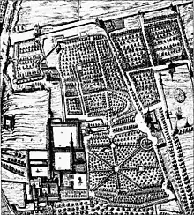 Olivares, with the intention of pleasing the monarch, planned in 1629 and started in 1630 the construction of a series of offices and pavilions as an extension of the Royal Quarters, which ended up forming the Buen Retiro Palace. The building of the palace was not something planned from the start, but occurred over a period of seven years (until 1640 during which further additions were built successively). Once finished, the palace consisted of more than 20 buildings and two large open squares used for court entertainments and various other acts. The palace complex was surrounded by a large expanse of gardens and ponds, giving it a playful character.