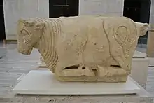 The Bull of Osuna is a limestone high relief Iberian sculpture, 82 cm high, dated from the end of the 5th century BCE, that is on display at the National Archaeological Museum of Spain in Madrid. It was found in the archeological site of the ancient Iberian city of Urso (Osuna) in Seville, Spain. The bull is ashlar and was carved, (probably in a Turdetani workshop), as a funeral monument. It is believed to have had some protective function.