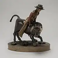 Many early Texas rangers, who had to be expert horse riders and later went on to become ranchers, learned and adapted Hispanic techniques and traditions to ranches in the United States. Many also enjoyed traditional Mexican celebrations, and H. L. Kinney, a rancher, promoter and former Texas Ranger staged what is thought to be the first Anglo-American organized bullfight in the southwest in 1852. This event also included a jaripeo competition and was the subject of newspaper reports from as far away as the New Orleans Daily Delta.[3] However, popular sentiment shifted away from various blood sports and both bullfighting and prize fighting were banned by the Texas legislature in 1891.[3] In the same time period, however, Wild West Shows began to add steer riding to their exhibitions, choosing to use castrated animals because steers were easier to handle and transport than bulls.[3] Additionally, informal rodeos began as competitions between neighboring ranches in the American Old West. The location of the first formal rodeo is debated. Deer Trail, Colorado claims the first rodeo was in 1869, but so does Cheyenne, Wyoming in 1872.[6]