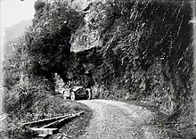 Job Lines began a link between Westport and Reefton in 1876, using horses from Westport and a coach from the Landing to Reefton.[47] By July 1877 the road through the Lower Gorge had improved sufficiently for the coach to run though to Westport.[48] The road near Tiroroa included two short tunnels,[49] until Fern Arch was demolished in 1937.[50]