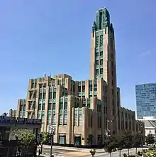 The exterior is notable for its 241-foot (73 m) tower whose top is sheathed in copper, tarnished green. At one time, the tower peak had a light that could be seen for miles around. The stylized relief, above the Wilshire Boulevard entrance, was designed by George Stanley,[4] designer of the Oscar.