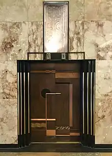 Shoppers entered the foyer which had travertine floors and elevators finished in nickel, brass, and gunmetal.