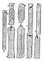 - ↑ Haddon, The Study of Man, p. 221: "Fig 38. Bull-Roarers from the British Isles."