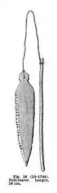 - ↑ Kroeber, "Ethnology of the Gros Ventre", p. 190: "Fig. 26 (50-1788). Bull-roarer, Length, 56 cm."