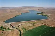 It is a crescent-shaped reservoir located 9 miles (14 km) west of Vale and a 45-minute drive from I-84. The reservoir and its dam have paved road access by Bully Creek Road from Vale W Highway. The reservoir was constructed by the Bureau of Reclamation in 1963[2] and has 985 acres (399 ha) with 7 miles (11 km) of shoreline and a total capacity of 31,650 acre-feet (39,040,000 m3). The dam is a zoned embankment dam with a crest length of 3,070 feet (940 m), total height of 121 feet (37 m) and sits at 2,500 feet (760 m) elevation.[3] The Bully Creek park is open April through October, has 33 campsites, a day use area with two covered shelters, a swimming beach and a two-lane boat ramp with dock.