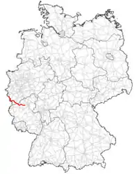 From Aachen, the road first runs south along the Belgian border. One curiosity on this part is a 3 km long strip at Roetgen where the German federal highway leads through Belgian territory. This strip has no connection to the Belgian road network, and the only notice of the border crossing is a small sign reading Belgien (Belgium in German). There is one house along this strip of road, which has a Belgian post code, but is connected to the German telephone network.