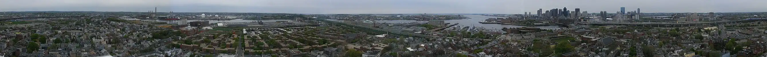 Breed's Hill is a glacial drumlin located in the Charlestown section of Boston, Massachusetts. It is located in the southern portion of the Charlestown Peninsula, a historically oval, but now more roughly triangular, peninsula that was originally connected to the mainland portion of Charlestown (now the separate city of Somerville) in colonial times by a short, narrow isthmus known as the Charlestown Neck. It is best known as the location where in 1775, early in the American Revolutionary War, most of the fighting in the Battle of Bunker Hill took place. In the 19th and early 20th centuries the peninsula's shape and connections to other landforms were significantly altered, with the waters of the Charles River between Cambridge and Charlestown heavily filled in.[8] Much of the hill is now occupied by residential construction, but the summit area is the location of the Bunker Hill Monument and other memorials commemorating the battle.