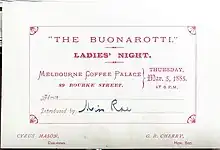 - ↑ The Buonarotti Conversazione. Tuesday, May 4th, 1886. Programme. Mason Firth & McCutcheon. Printers, Melbourne 1886. Private Collection