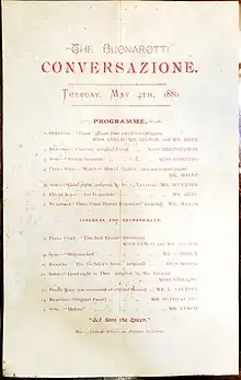 "The Buonarotti" Conversazione Programme for Tuesday, May 4th, 1886 offered;[17]