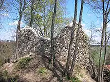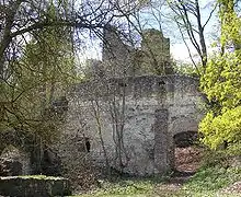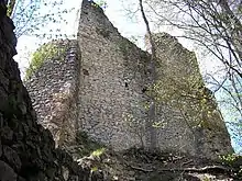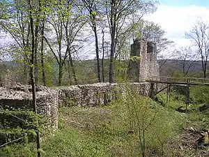 The curtain wall of the 13th/14th-century castle is nearly all gone, except for the south wall with a gate house. On the southwest corner the wall of the tower house is still visible. The construction is 10 m (33 ft)m long and still 7–8 m (23–26 ft) high and about 2.2 m (7.2 ft) thick. The outer walls with the foundations of the round towers on the hill side, have been extensively restored and repaired. They reflect the condition of the castle in the 16th century. On the valley side, the two tall square towers date from the 1677 reconstruction. The towers, crowned with pyramidal roofs, are visible across the valley.