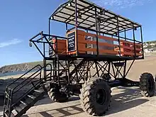 The island is approximately 270 yards (250 m) from the mainland at Bigbury-on-Sea and is approachable on foot at low tide.[15] At high tide, the sea tractor, which is operated by the hotel, transports passengers back and forth.[17] The original vehicle was constructed in 1930 (see 1933 photo); the current third generation tractor dates from 1969.[20] The vehicle drives across the beach with its wheels underwater on the sandy bottom while its driver and passengers sit on a platform high above. Power from a Fordson tractor engine is relayed to the wheels via hydraulic motors.[21]