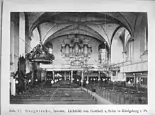 The wooden vault of the nave was covered with stucco, and only the apses had a stellar vault. The pulpit was on the long side of the nave covered with a crown. The organ was the work of Johann Josua Mosengel's assistant Georg Siegmund Caspari (1693–1741), who built the instrument as his “Probstück“ (=masterpiece) under Mosengel's supervision.[1] It was, like many organs in Konigsberg, decorated with the Prussian eagle and is considered to be the last new built organ in the area of East Prussia, which was equipped with a choir organ. Commissioned by commerce official Charles Cabrit, the church's portal was designed in 1727 with allegorical sandstone figures of justice, love and, charity.