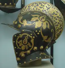 Commonplace throughout Europe, it first came into use early in the 16th century and had attained its classic form by c. 1550.[5] Accompanied by plate armour, burgonets were mostly worn by cavalry: cuirassiers, demi-lancers and hussars (Polish hussars). The Border Reivers, of the English-Scottish borderlands, were very fond of burgonets and the morion in Elizabethan times, and as a result reivers were often called steil (steel) bonnets.[6][7] Burgonets were also a popular helmet type among the Polish winged hussars, where they merged with types of lobster-tailed pot helmets (Zischägge), often featuring a nasal bar or facial guard.