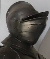 The burgonet helmet is characterised by a skull with a large fixed or hinged peak projecting above the face-opening, and usually an integral, keel-like, crest or comb running from front to rear. Attached to the skull are substantial hinged cheekpieces which usually do not meet at the chin or throat. A flange projects from the lower parts of the skull and cheekpieces to protect the back and sides of the neck. Though typically a relatively light helmet and open faced, a falling buffe, a sort of visor that was closed by being drawn up rather than down, was sometimes used. Some helmets, often termed "close burgonets", were made which took elements, such as the peak, crest and falling buffe, of the burgonet and combined them with the hinged bevor of the close helmet.[2][3][4]