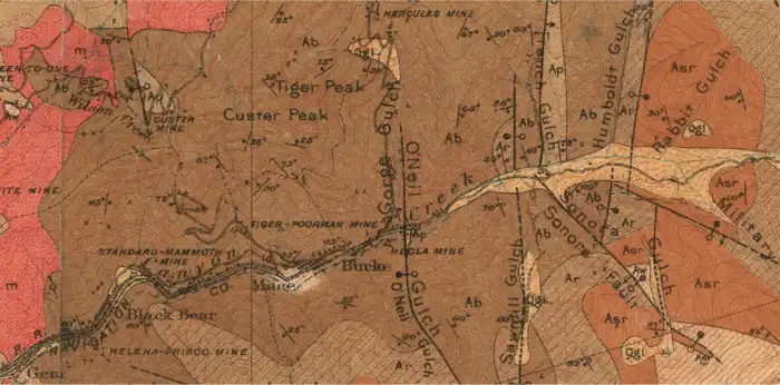 In 1884, miners discovered an abundance of lead and silver in the Burke Canyon.[8] The first mine in Burke, the Tiger Mine, was discovered in May 1884.[8] That same year, the Tiger Mine was sold to S.S. Glidden for $35,000.[9]