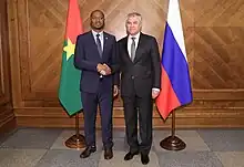 Burkina Faso–Russia relations (Russian: Российско-буркинийские отношения) are the bilateral relations between the two countries, Burkina Faso and Russia. Diplomatic relations between Burkina Faso and the Soviet Union were established for the first time on February 18, 1967. After the breakup of the Soviet Union, Burkina Faso recognized Russia as the USSR's successor. However financial reasons has shut the embassies between the two nations. In 1992, the embassy of the Russian Federation in Ouagadougou was closed, and in 1996, the embassy of Burkina Faso in Moscow was closed. Burkina Faso has since re-opened its embassy in Moscow.[1] Russia is accredited to Burkina Faso from its embassy in Abidjan (Côte d'Ivoire). In July 2023, the embassy of Russia re-opened.