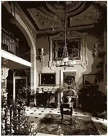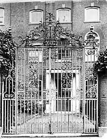 The central part of the house, and probably the oldest, was ornamented by brick pilasters. The entrance hall was of Purbeck stone with a fireplace decorated with Flemish tiles. In the early 1900s, the kitchen still had a roasting spit that was thought to be 200 years old and a deep well that still provided water. The drawing room was on the first floor with three round-headed windows and a chimney-piece in white marble showing Alexander the Great. Above the drawing room were the bedrooms. One room contained a fireplace with the initials BDM for Benjamin and Margaret Deicrowe.[7] A noted feature of the house was its iron gates, believed to have been made by the blacksmith Thomas Warren (1673-1736).[9]