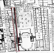 Burlington Gardens was once part of Vigo Lane (later renamed Vigo Street) which originally ran all the way from Bond Street to Glasshouse Street before the part behind Burlington House was renamed Burlington Gardens[4] by 1831.[5]