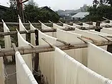 Burmese cuisine uses a wide variety of noodles, which are prepared in soups, salads, or other dry noodle dishes and typically eaten outside of lunch, or as a snack.[2] Fresh, thin rice noodles called mont bat (မုန့်ဖတ်) or mont di (မုန့်တီ), are similar to Thai khanom chin, and feature in Myanmar's national dish, mohinga. Burmese cuisine also has a category of rice noodles of varying sizes and shapes called nan, including nangyi (နန်းကြီး), thick udon-like noodles; nanlat (နန်းလတ်), medium-sized rice noodles; nanthe (နန်းသေး), thinner rice noodles; and nanbya (နန်းပြား), flat rice noodles.[43] Cellophane noodles, called kyazan (ကြာဆံ, lit.'lotus thread') and wheat-based noodles called khauk swe (ခေါက်ဆွဲ),[43] are often used in salads, soups, and stir-fries.[2]