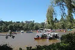 Burnham Lake, formerly known as the City Pond,[18] is about a century-old man-made lake situated at the center portion of Burnham Park. In early 2013, it underwent dredging which saw the removal of a meter (3.28 feet) thick silt sitting on the lake's bed. It was also dredged in 1994. After the 2013 dredging, the lake's volume is 34,000 cubic meters (1,200,000 cu ft).[19] The depth of the body of water is about 3.04 meters (10.0 ft). Boat rentals are available in the lake catering to tourists and residents.[20]