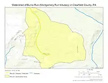 Course and Watershed of Burns Run (Montgomery Run tributary) in Clearfield County, Pennsylvania, USA
