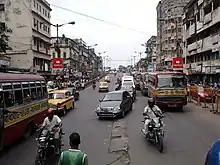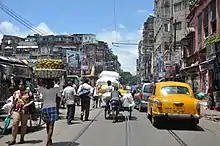 Traffic in the area, including the approach road to Howrah Bridge, has been a long-standing problem for people passing through the area. Pedestrians are forced to walk on roads along with vehicles. While lorries, taxis, vans and three-wheel goods carriers crowd the main roads, slow-moving vehicles like cycle-vans and carts clog the side-streets. A large number of governmental public buses and private buses ply through Burrabazar. Kolkata tram route no. 18 serves Burrabazar (via MG Road).[8] Braborne Road Flyover (1.2 km stretch) connects Howrah Bridge with Braborne Road in Burrabazar.[9]