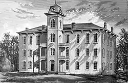 The college closed at the outset of the Civil War in 1861 as many of its male students left to fight in the Confederate army.[2] The college's relative isolation protected it during the first half of the war, though it was eventually occupied by Union troops.[1] With the help of Carnes, who had returned to the area to escape the horrors of the war, the school briefly reopened in 1864. It was forced to close by the Union Army, however, due to concerns over Confederate guerrilla activity in the area. The Union Army occupants used the main hall as a barracks, and dormitories were converted into stables. The campus grounds were trampled and damaged, and the buildings were left in a state of ruin. At the end of the war, the college's trustees sold part of its campus to raise funds for repairs. With Carnes' help, the school managed to reopen shortly after the close of the war. Martin White, a Burritt graduate remembered by students for having walked the entire distance from his home in North Carolina to Spencer to enroll at the school, was hired as president. Carnes was rehired as president in 1872.[3]