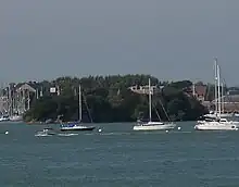 The island overlooks Portsmouth harbour.[1] At low tide a spit connects it with Priddy's Hard.[1] It has been suggested that the name dates from the 17th century and is derived from being within the borough of Gosport.[2]