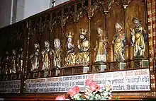 The choir portal of the church is richly decorated. The doorway displays Gothic sculptures depicting a blessing Christ, apostles and saints, as well as a large frieze spanning the whole of the portal, depicting the Parable of the Ten Virgins. The choir, and hence the choir portal, was probably built by a stonemasons' workshop sometimes referred to as Egypticus, which was active on Gotland during 1330-1380. The same workshop probably made an unusual, elaborate carved limestone choir bench inside the church, on which traces of original paint are still visible.[1][2]