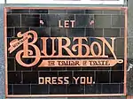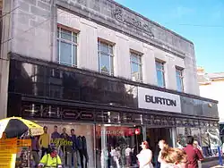 The Burton clothing company was founded by Montague Burton in 1903.[1] Originally named the Cross-Tailoring Company, the business grew to become the world's largest tailoring company by Burton's death in 1952.[1] During rapid expansion in the 1920s and 1930s, fuelled in part by contracts to supply uniforms to the British Army throughout World War I, Burton established a distinctive architectural template for his stores nationwide. Using an in-house architectural team, led firstly by Harry Wilson and then by Nathaniel Martin,[2] the stores were constructed in an Art Deco style, "the uncompromising moderne of the Burton house style (being) used in every store in the land."[3]
