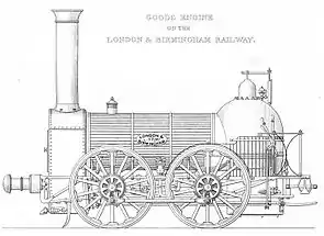 Edward Bury set himself up as an iron founder in Liverpool in the 1820s and manufactured various metal goods including marine steam engines as well as railway locomotives.[2] Bury's first locomotive was the 1830 Dreadnought, an 0-6-0 which was targeted at the 1829 Rainhill Trials, but construction was completed too late.[3] The basis of the Bury Bar Frame locomotive type emerged in 1830 as Bury's second locomotive 0-4-0 Liverpool, and while it had some issues it also had advantages compared to contemporary Stephenson locomotives.[3] It is understood that most of the engineering was done by Bury's partner Kennedy, with Bury focusing more on the business side.[4]
