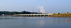 The original Buster Boyd Bridge was built at a cost of $120,000, with Mecklenburg County paying two-thirds of the cost and York County, South Carolina paying the remaining one-third.[2] Mecklenburg County raised their portion of the funds by selling $75,000 in bonds[3] The bridge spanned 1,378 feet across in 10 spans. It officially opened to automobile traffic on January 9, 1923.[2] The bridge featured an excessively high lake clearance due to known plans by Catawba Power Company to build a larger dam, which would make Lake Catawba much larger and deeper in the following year.[4]