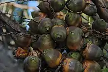 The shape of the fruit is ovoid. The shape of the 1.8-2.8 by 1-1.7 cm nut is elongated, ellipsoid or turbinate, and it weighs 1.1-3.5g.[4][6] The ripe fruit are 2.7–4.2 cm (1.1–1.7 in) by 1.5–3.8 cm (0.59–1.50 in) in size, weigh 8–23 g (0.28–0.81 oz), and have a persistent perianth. The fruit may be coloured yellow, orange, red, or purple,[6] while the flesh is yellow, sweet, juicy, and slightly fibrous.[6][7] The nut often has a beak or protuberance at its extremities, and has homogeneous endosperm and from 1 to 3 seeds.[6]