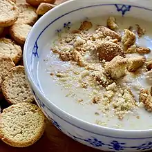 Koldskål is made with buttermilk and other varying ingredients: eggs, sugar, cream and/or other dairy products, vanilla, and sometimes lemon.[1] The dish arose when buttermilk became commonly available in Denmark in the early 1900s and was eaten chilled most days during the summer as a dessert or snack. Since 1979, there have been ready-made varieties on the Danish market, originally from Esbjerg Dairy, but now from a range of dairies, including Arla.[2]