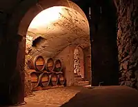 In a large house, the buttery's principal function was storage of wine and its preparation for serving. Candles were also dispensed from the buttery, as was beer, to those lower members of the household not entitled to drink wine.[1] Today in colleges in Cambridge, Dublin, and Oxford, drinks are served from the "Buttery Bar".[2] The buttery generally had a staircase to the beer cellar below.[3] The wine-storage area of the buttery, in keeping with the higher value of its contents, was often more richly decorated to reflect the higher status of its function.[4]