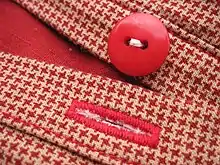 • A keyhole buttonhole is a special case of a thread-finished buttonhole that has a round hole at the end of the buttonhole slit, reinforced with a fan-shaped array of stitches. Because a button-closed gap in a garment is normally under some stress, the button will tend to move towards the end of the buttonhole closest to the gap in the garment.[16] A keyhole at the end of the buttonhole closest to the gap accommodates the button's shank without distorting the fabric. Keyhole buttonholes are most often found on tailored coats and jackets.[12] This buttonhole is normally machine-made due to the difficulty of achieving it by hand working.